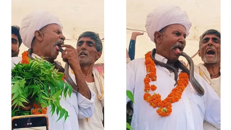 Snake Kiss Viral Video: इंस्टाग्राम पर एक ऐसा वीडियो वायरल हो रहा है, जिसे देखकर लोगों के रोंगटे खड़े हो रहे हैं, लेकिन हंसी भी छूट रही है. इस वीडियो में सफेद पोशाक और पगड़ी पहने एक अधेड़ उम्र का आदमी नजर आ रहा है. गले में सांप डालकर घूमते लोगों को तो आपने कई बार देखा होगा, लेकिन ये जनाब उससे भी एक कदम आगे हैं. वीडियो का ट्विस्ट यानि खास बात ये है जब ये आदमी अपनी जीभ यानि जुबान बाहर निकालता है… तो सांप उसकी जीभ से चिपक जाता है या यूं कहें कि काट लेता है. यह सीन देखकर न सिर्फ कैमरा चलाने वाला, बल्कि इंटरनेट पर इसे देखने वाले लोग भी सकते में हैं.