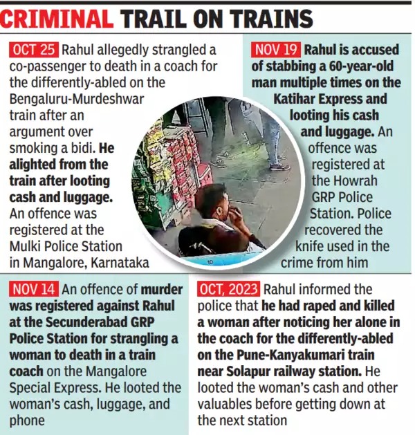 Detailing the previous crimes Jat had committed, the police official said, “Only a day before his arrest, he had looted a woman and murdered her on a train near Secunderabad railway station. In October, he had raped and murdered a woman on a train near Solapur railway station in Maharashtra. He stabbed to death an elderly man on a Katihar Express train near Howrah railway station in West Bengal. He is also accused of murdering a train passenger in Mulki in Karnataka.